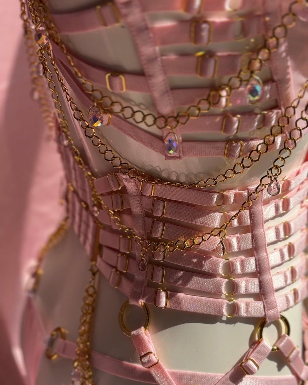 Couture Enchaînée is a statement piece that blends luxury craftsmanship with audacious design. Featuring intricate straps, delicate chains, and shimmering stones, this piece is both sculptural and sensual, designed to celebrate the confident, empowered wearer.